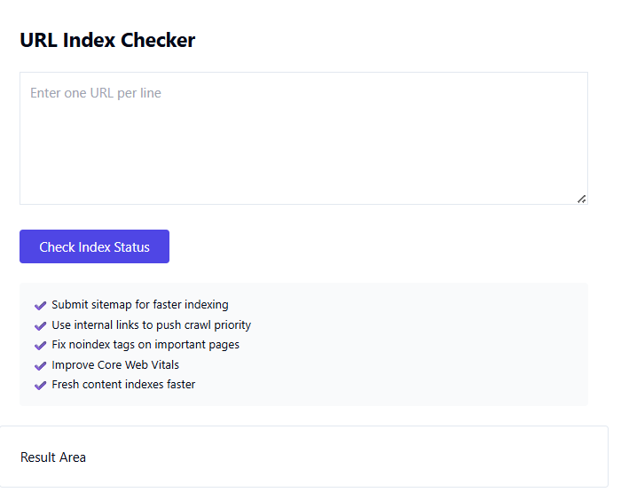 A Google Index Checker is an SEO tool that verifies whether a specific webpage is indexed by Google. It checks if your URL appears in Google’s search database and helps identify indexing issues that may affect search visibility.