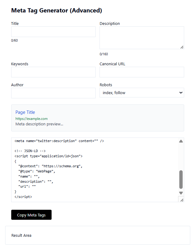 A Meta Tag Generator allows you to create properly structured SEO meta tags including title, description, keywords, canonical URL, robots directives, and JSON-LD schema markup without writing manual code.