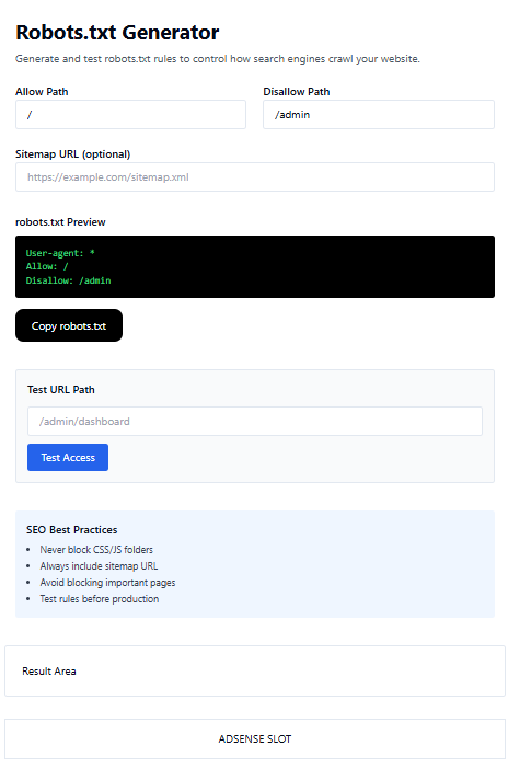 The TaskHug Robots.txt Generator provides allow path configuration, disallow path configuration, optional sitemap URL field, live robots.txt preview, copy robots.txt button, URL path testing feature, and built-in SEO best practices reminders. It is ideal for website owners, bloggers, developers, and SEO professionals.