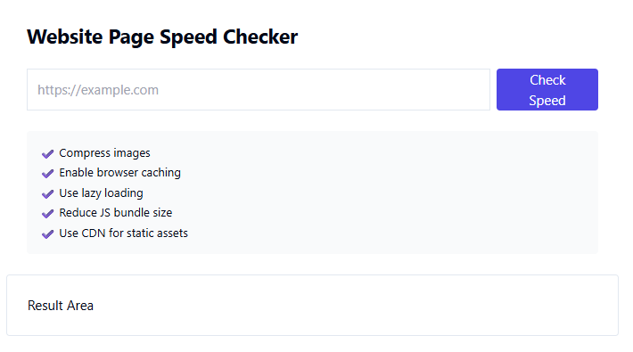 The TaskHug Website Page Speed Checker allows you to enter a website URL, analyze performance instantly, review speed-related insights in the result area, and identify optimization opportunities. It is simple, fast, and designed for bloggers, developers, ecommerce owners, and SEO professionals.