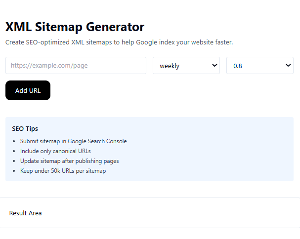 The TaskHug XML Sitemap Generator allows you to add individual page URLs, select change frequency such as daily, weekly, or monthly, assign priority values between 0.0 and 1.0, generate structured XML output instantly, and export your sitemap for deployment. The interface is simple and designed for beginners as well as SEO professionals.