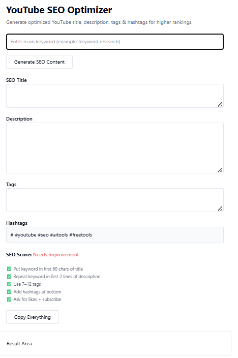 The YouTube SEO Optimizer Tool from TaskHug helps creators, marketers, and businesses optimize video titles, descriptions, and tags to improve discoverability.